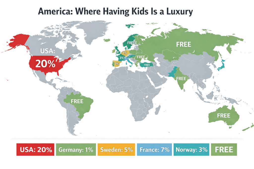 Other countries bundle healthcare, childcare, education, and parental leave into their taxes and provide them as services.