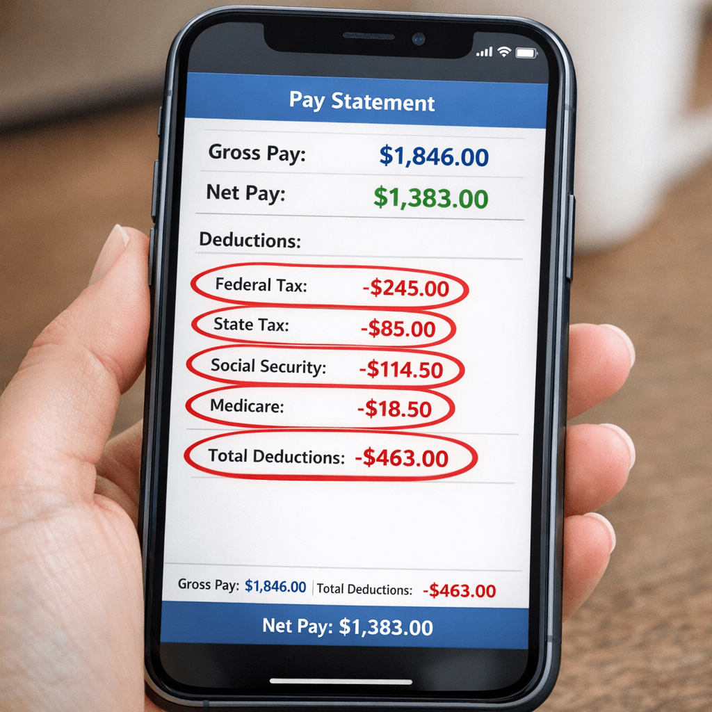 Sarah’s paycheck tells the same story. Her gross bi-weekly pay of $2,385 becomes $1,764 after deductions take their cut—$748 gone per paycheck, or 31.4%.